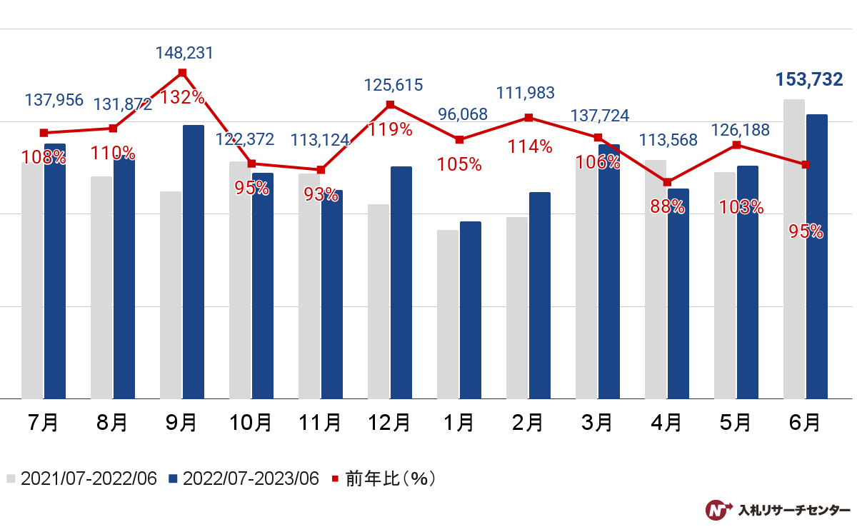 2023年6月の落札案件数の総計は 153,732件で、前年比95%となりました。