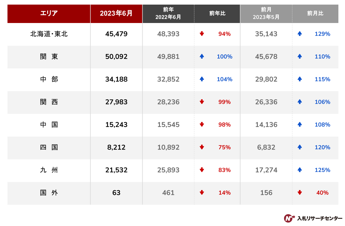 2023年6月のエリア別公示案件数は、エリアにより、前年より増加・減少の傾向が分かれました。