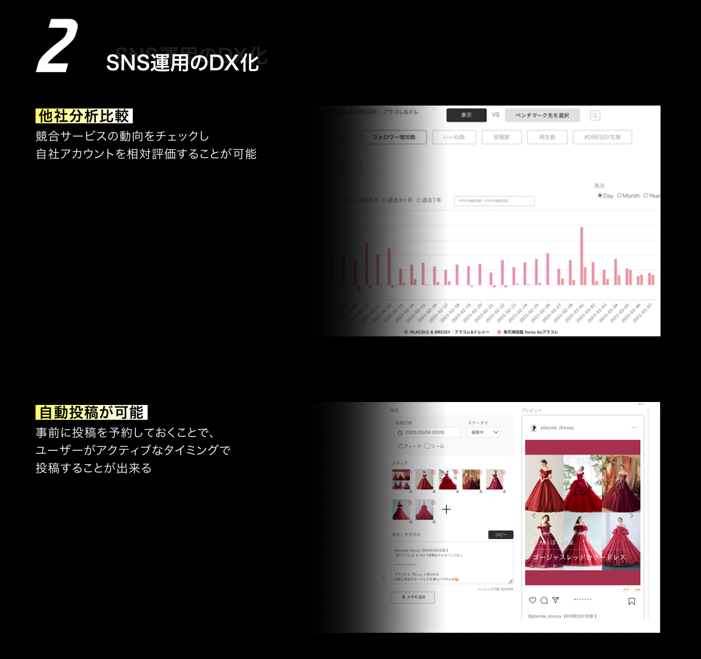 コンサルティングプラン(月額35万~):上記にプラスし、アカウント立ち上げから、フォロワー数・エンゲージメント改善まで専任担当を付けて支援。コンテンツ作成から毎日の投稿作業、月次打ち合わせを実施。自社メディアと60社90アカウント以上の運用実績の成功ノウハウを可視化したツールです。ブライダル企業のInstagram運用効率の最大化を目指し、分析ツールを提供いたします。また、Instagramフィードのみならず今注目のTikTokショート動画に特化したプランも用意しております。