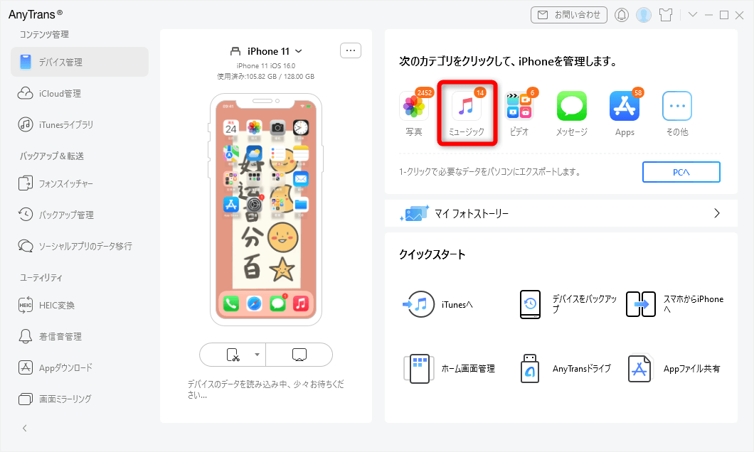 1.AnyTransを起動し、USBケーブルでお使いのiPhoneやiPadをMacに接続します。カテゴリから「ミュージック」を選択します。