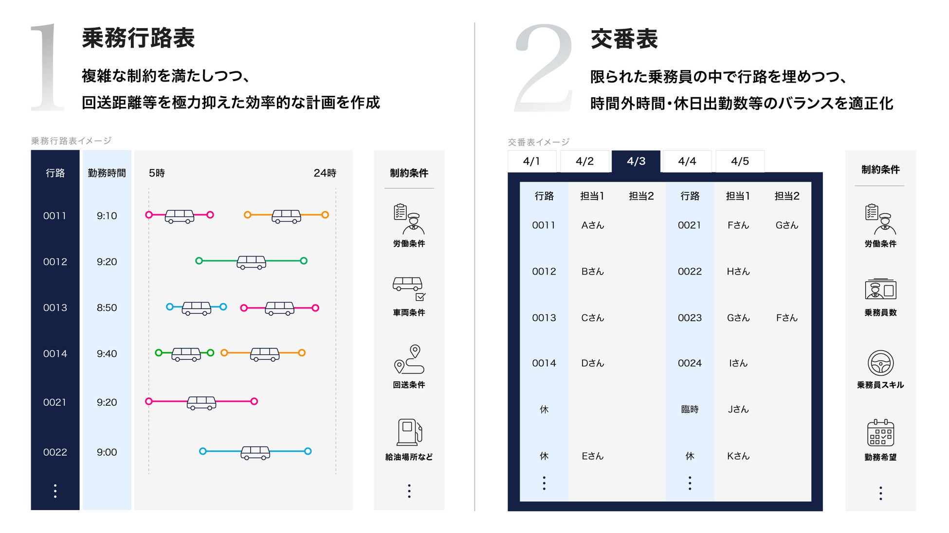 これらの課題解決に向けてALGO ARTISは、名鉄バスの協力の下、同社の経験・ノウハウ・実務上の複雑な運用ルールをAI(アルゴリズム)へ移植し、乗務行路表および交番表を最適化するソリューションの開発を進めてまいります。