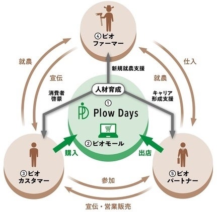そこで、PlowDays株式会社は、そのような課題を克服すべく「ビオソーシャルプラットフォーム」という仕組みを構築しました。この「ビオソーシャルプラットフォーム」とは、ビオファーミング(自然栽培)に関連する商品やサービスを消費する人(ビオカスタマー)と、ビオファーミングの普及につながる活動を仕事として行う人(ビオパートナー)と、ビオファーミングで生産する農家(ビオファーマー)との三者相互協力によって便益が生まれる構造のことです。これによって、ビオファーミングの市場を拡大し、人々の健康増進と環境問題の改善を図ります。