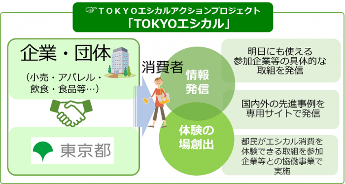 TOKYOエシカルアクションプロジェクト:通称「TOKYOエシカル」とは、エシカル消費をより多くの都民に広げていくため、エシカル消費につながる取組を実施されている企業・団体の皆様とネットワークを構築し、エシカル消費を日常にするための社会的ムーブメントを創出するとともに、エシカル消費を実践しやすい環境の整備を目指していくプロジェクトです。