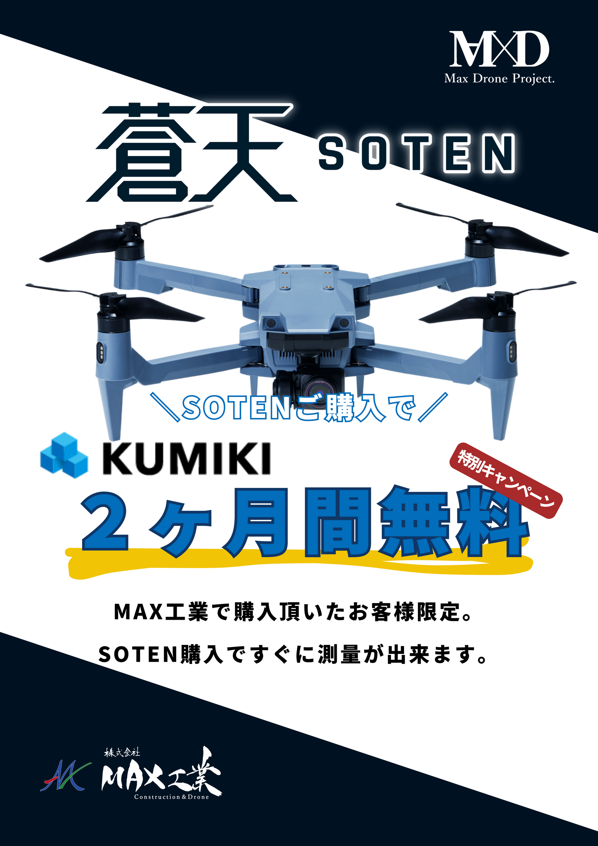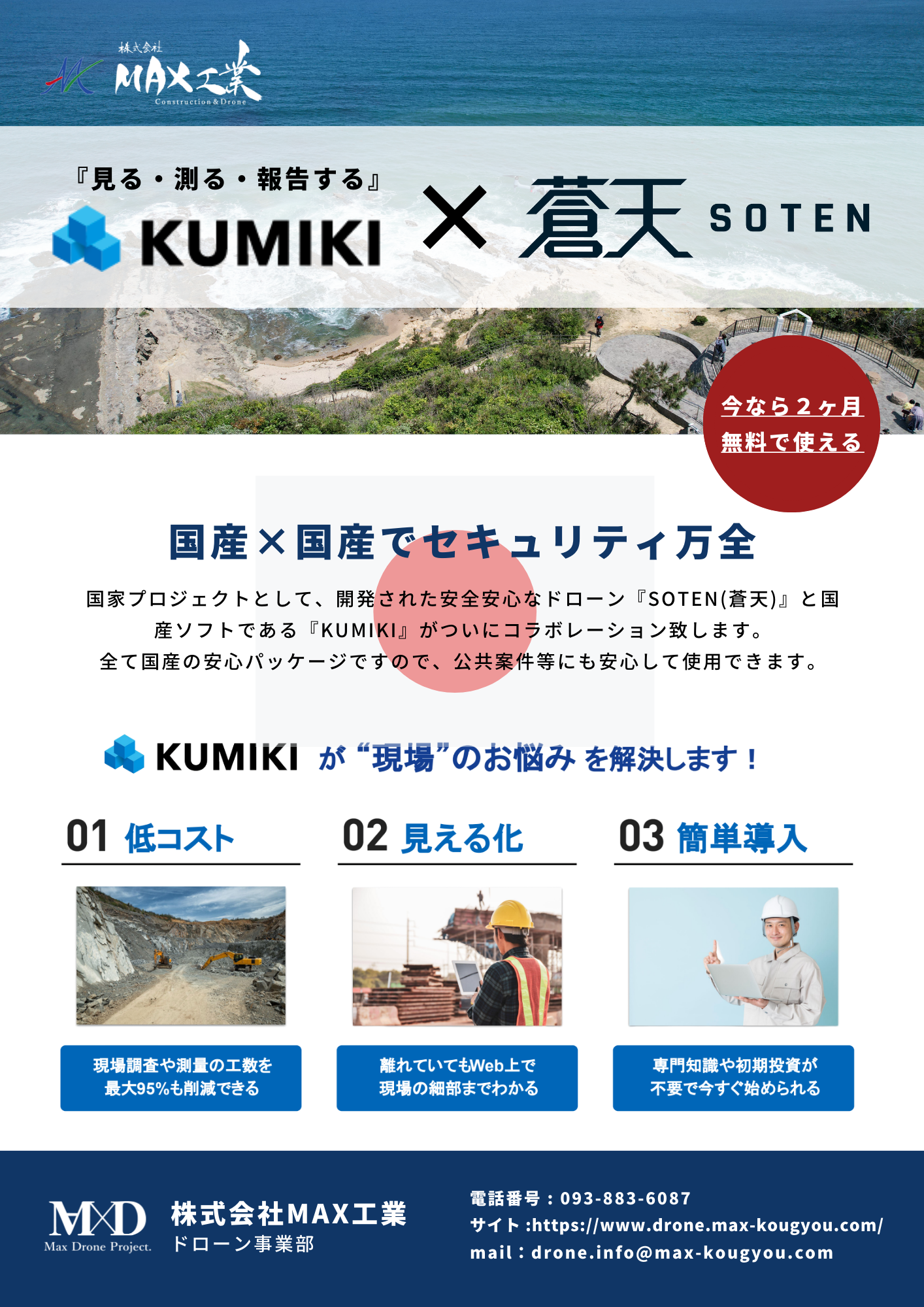 この代理店契約により、MAX工業はスカイマティクスの『KUMIKI(くみき)』と国産ドローン『SOTEN(蒼天))をパッケージ販売する権利を得るとともに、スカイマティクスの専門知識と技術を活用して、顧客に最適なソリューションを提供することができます。