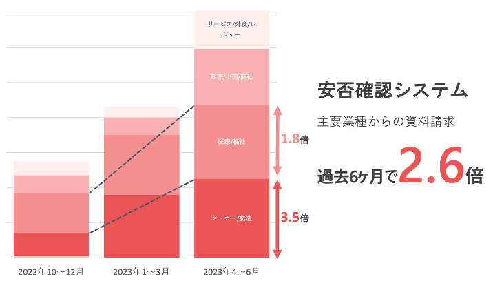 「2024年3月期 第1四半期 IT製品トレンド」5位にランクインした「安否確認システム」の請求のうち、最も多かった業界はメーカー/製造、次いで医療/福祉、卸売/小売/商社となりました。特にメーカー/製造業界からの資料請求は6ヶ月前に比べ約3.5倍にも増加しています。資料請求をした企業の従業員に対してITトレンドが行ったヒアリングでは「事業継続計画(BCP)対応のため」という回答が大半を占めました。