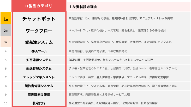 今回最も上昇した製品カテゴリーは「チャットボット」。4位の「RPAツール」などとともにAIチャットボットや大規模言語モデルの目覚ましい進化が企業DXにも影響を与える結果となりました。資料請求ユーザーへのヒアリングからその背景には業務の自動化・効率化や、顧客のみならず社内の問い合わせ対応、社内のナレッジ共有といった最新のAI技術に期待される目的も目立ちました。