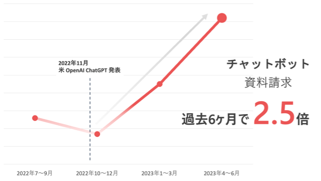 2024年3月期 第1四半期、最も上昇した製品カテゴリーとなった「[チャットボット](https://it-trend.jp/chatbot)」の製品資料請求数は2022年11月に米OpenAIがChatGPTを一般公開した時期から約6ヶ月で2.5倍に増加しました。