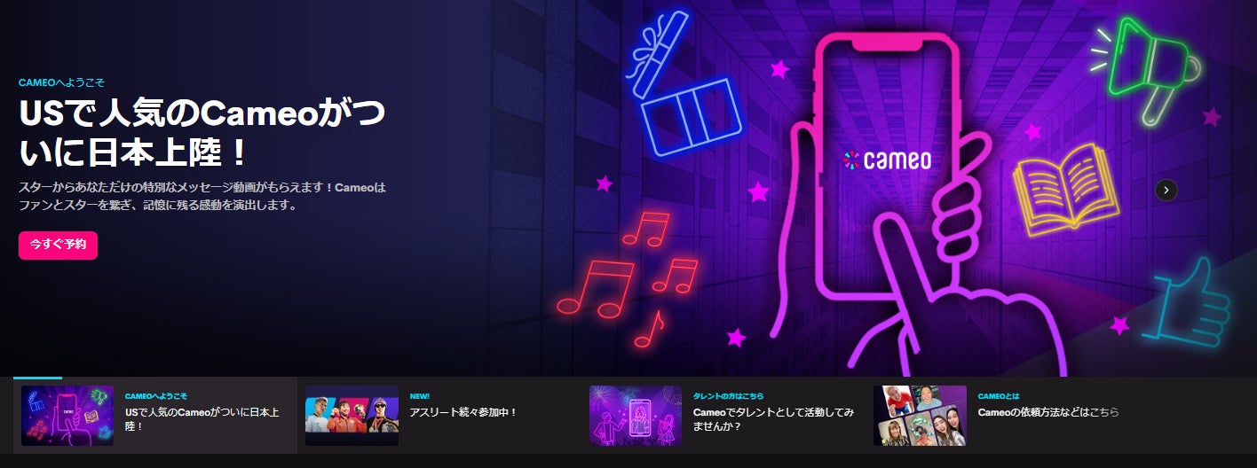 Cameo(キャメオ)は、2017年にSteven Galanis(スティーブン・ガラニス)、Devon Townsend(ディーボン・タウンセンド)およびMartin Blencowe(マーティン・ブレンコウ)らによってアメリカではじまった、タレントがファンへ個別のメッセージ動画を送ることができるリーディングマーケットプレイスです。パーソナライズされたビデオメッセージ、魅力的なファン体験、マーケティングやイベントのパートナーシップという形で、ファンやブランドと数万人のポップカルチャーパーソナリティを直接つなぎます。Cameoは2017年のサービス開始から5年間で合計約400万件、2021年だけでも約140万件のメッセージ動画を届けてきました。2022年には、ソフトバンク株式会社の支援のもと、日本での事業展開を開始いたしました。ファンに唯一無二の感動体験を届けることをミッションに、今後もファンとタレントを繋いでまいります。
