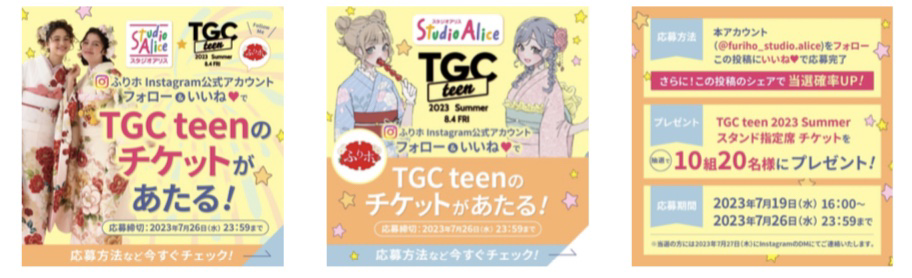 スタジオアリスのふりホInstagram公式アカウントをフォロー&いいねすると、TGC teen 2023 Summerのスタンド席チケットが抽選で10組20名様にあたるキャンペーンがスタート。