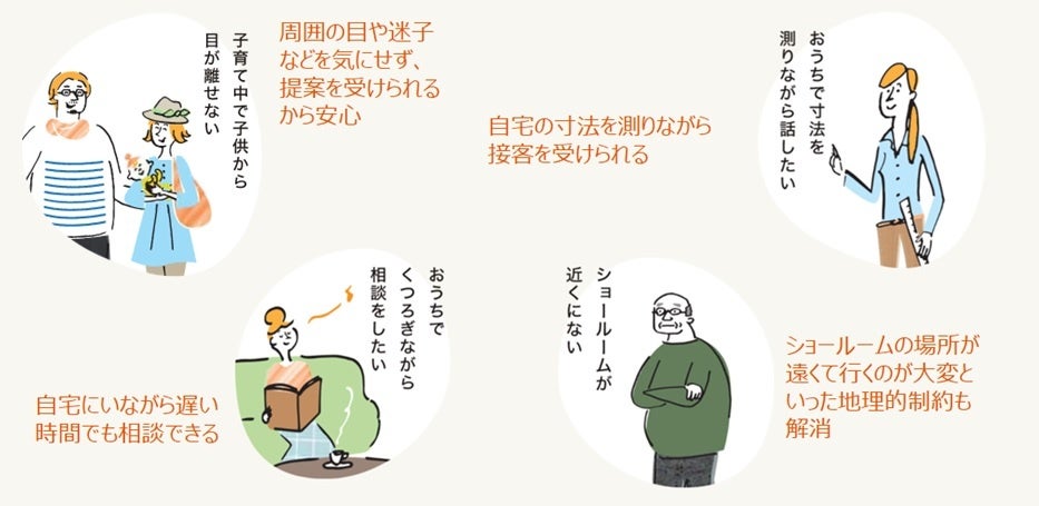 LIXILオンラインショールームは、スマホ・パソコン・タブレットの画面を通して、ショールームコーディネーターにご相談できるサービスです。デジタルツールを活用することで、お客さまが自宅にいながら、オンライン上でショールームコーディネーターによる商品のご案内を受けられるほか、ご要望に沿ったプランの作成や3Dの完成予想イメージをその場でご覧いただくことが可能です。年中無休でショール―ムが閉館後の夜間の時間帯(21時まで)も対応しています。 オンラインショールームを使えば、ショールームに行くことなく、ご自宅から好きな時間帯につなぐことができるので、妊婦の方や小さいお子さまがいるご家庭でも、安心してご相談いただけます。サービス開始より、営業時間やサービス内容の拡大を図り、累計150,000組以上(2023年4月末時点)のお客さまにご利用いただいています。