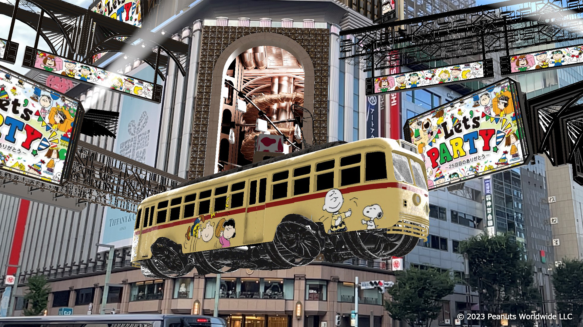 「Virtual GINZA mitsukoshi」ではスヌーピーと仲間たちがお店を飛び出して銀座4丁目交差点でもパーティーをしているかのようにバーチャルギンザをジャックします。1967年まで銀座の街を走っていた路面電車を彷彿とさせるトレインもスヌーピーと仲間たちでかわいくラッピングしています。