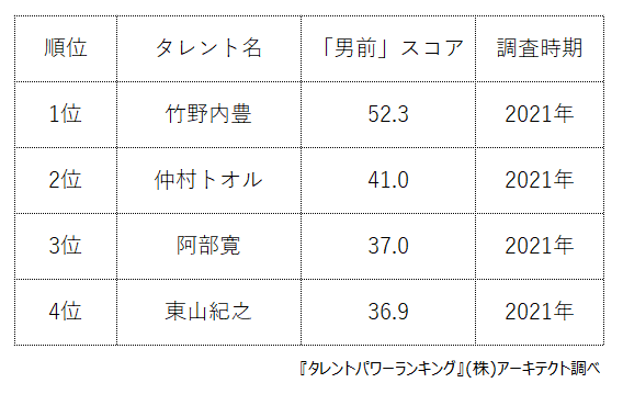 『タレントパワーランキング』では、タレントパワーランキングに登録されている「男前な」イメージを持たれている50代の俳優のスコアを調査。