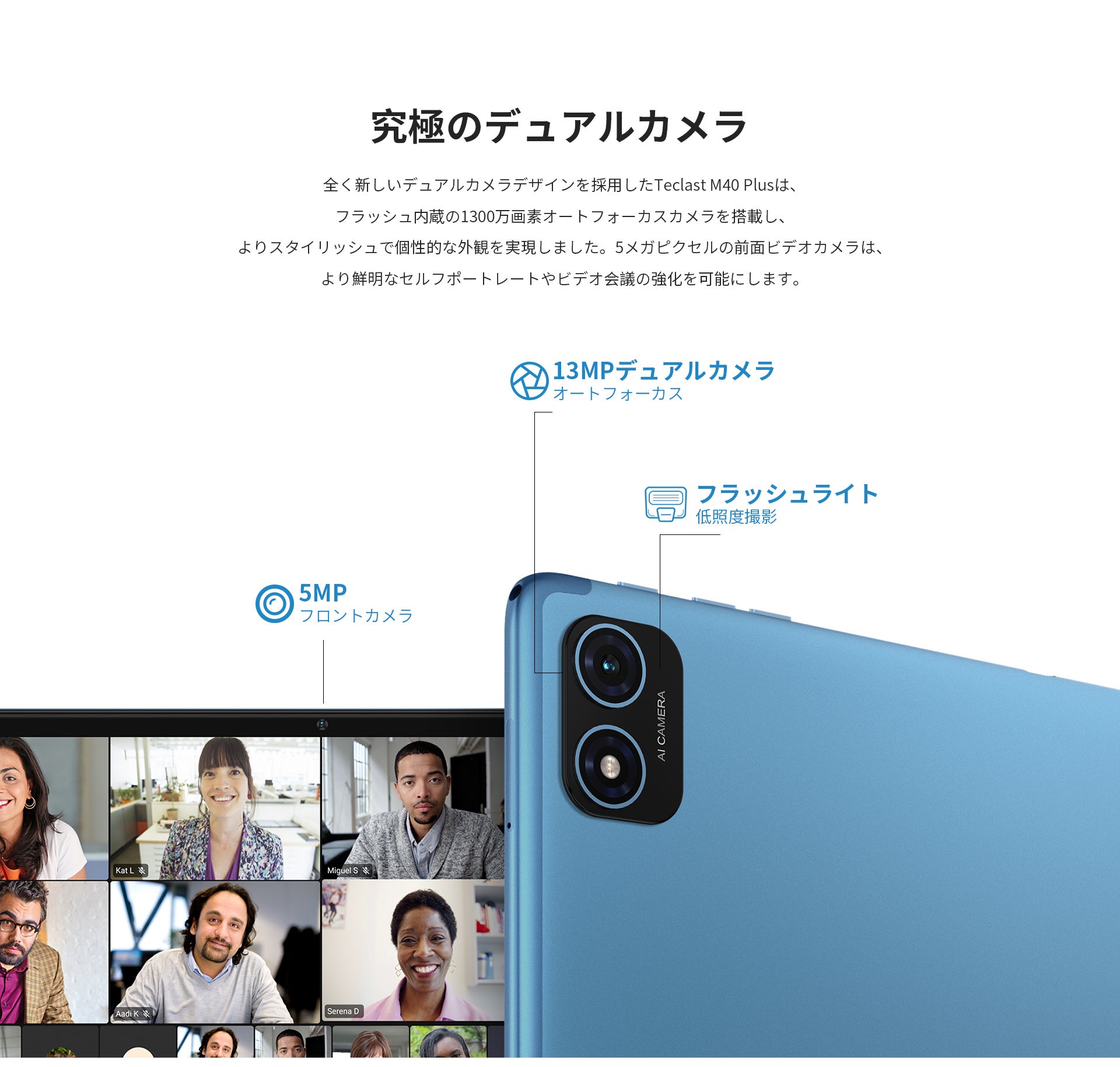 全く新しいデュアルカメラデザインを採用したTeclast「M40Plus」は、フラッシュ内蔵の1300万画素オートフォーカスカメラを搭載し、よりスタイリッシュで個性的な外観を実現しました。5メガピクセルの前面ビデオカメラは、より鮮明なセルフポートレートやビデオ会議の強化を可能にします。
