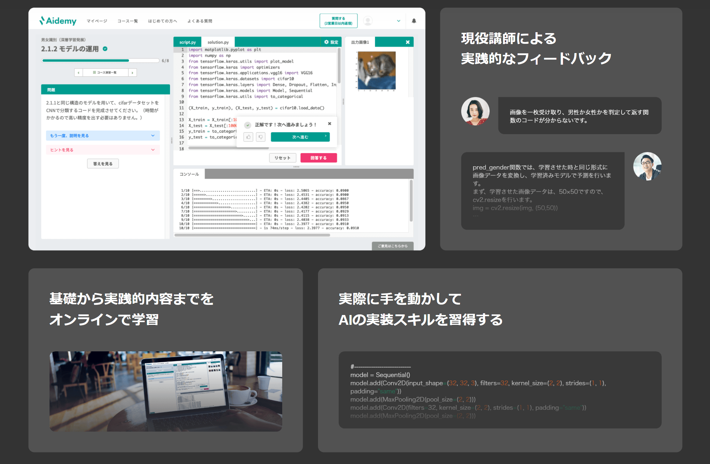 ・コードを書く実践問題や添削課題など、実際に手を動かしてAIの実装スキルを習得