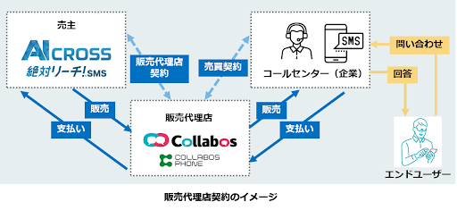 このような課題に対応するため、このたび、AI CROSSとコラボスは販売代理店契約を締結しました。クラウド型コールセンターシステム「COLLABOS PHONE」とSMS送受信サービス「絶対リーチ!SMS」の連携により、企業が求めるコールセンターシステムをワンストップで提供します。具体的には、コールセンターの時間外や電話がつながらない際に、お客さまの携帯電話へWebフォームやチャットボットのURLをSMSメッセージで自動送信します。これによりお客さまに自己解決の機会を提供することで待ち時間を削減するとともに、オペレーターの生産性向上を実現します。