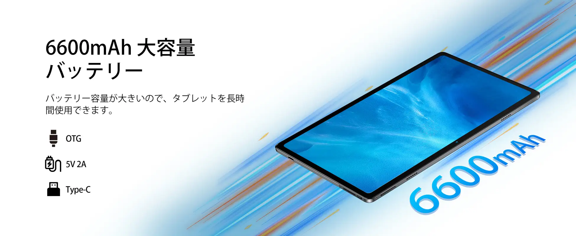 【8GBのランニングメモリと128GBの高速ストレージを搭載】ストレージに拡張可能なMicroSDをサポートしています。メモリ容量が大きいとタブレットはサクサク動くようになります。Webサイトや動画を見たり、重いアプリや高画質のゲームを楽しみいただきます。お気に入りの本、曲、写真、映画、ゲームなど、好きなものをすべてダウンロードして保存できます。容量不足に困ることなく十分にお楽しみいただきます。6600mAhの大容量バッテリーとAIインテリジェント電源管理により、7時間の映画・読書・ブラウジングを楽しむことができます。