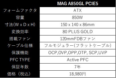 製品URL:https://jp.msi.com/Power-Supply/MAG-A850GL-PCIE5