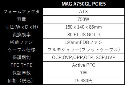 製品URL:https://jp.msi.com/Power-Supply/MAG-A750GL-PCIE5