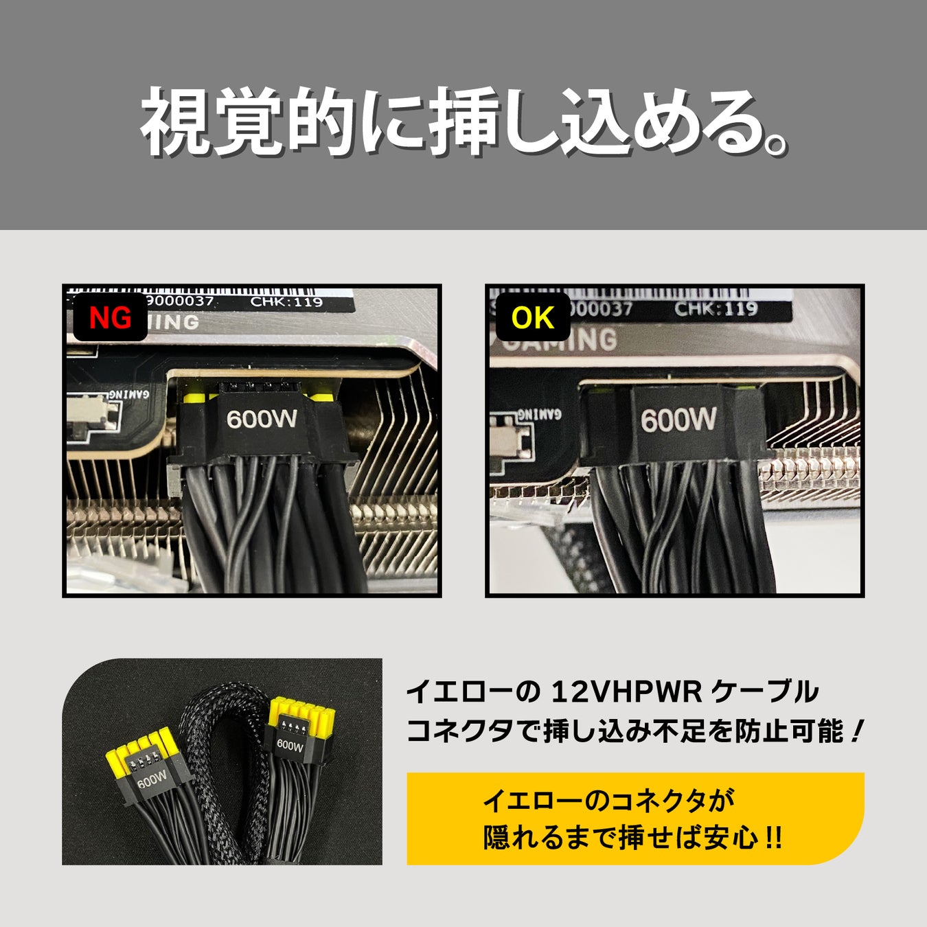 また、12VHPWRコネクターがイエローになっており、挿し込み具合が視認しやすい安心設計で、PC組み立てが初めての方にもおすすめです。