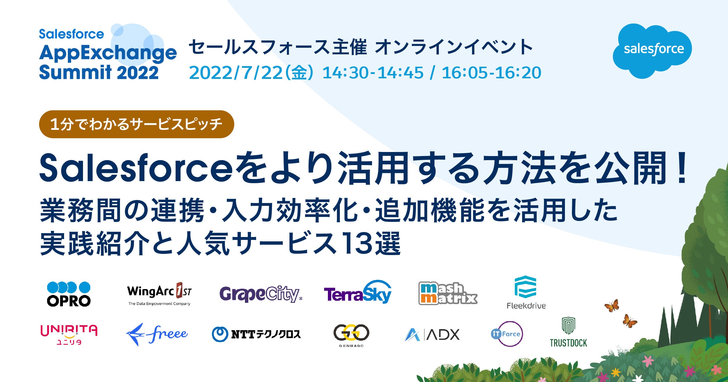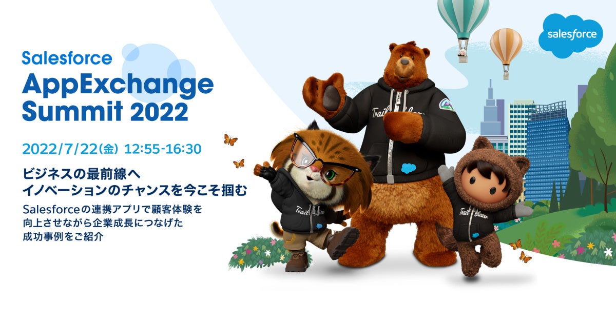 Salesforce AppExchange Summit 2022は株式会社セールスフォース・ジャパンが主催するSalesforceの連携アプリを紹介するイベントです。様々な業種・業務に関する活用事例などを紹介するほか、最適なビジネスアプリケーションを探したい方へ向けた出展企業ブースや製品紹介ピッチがあります。