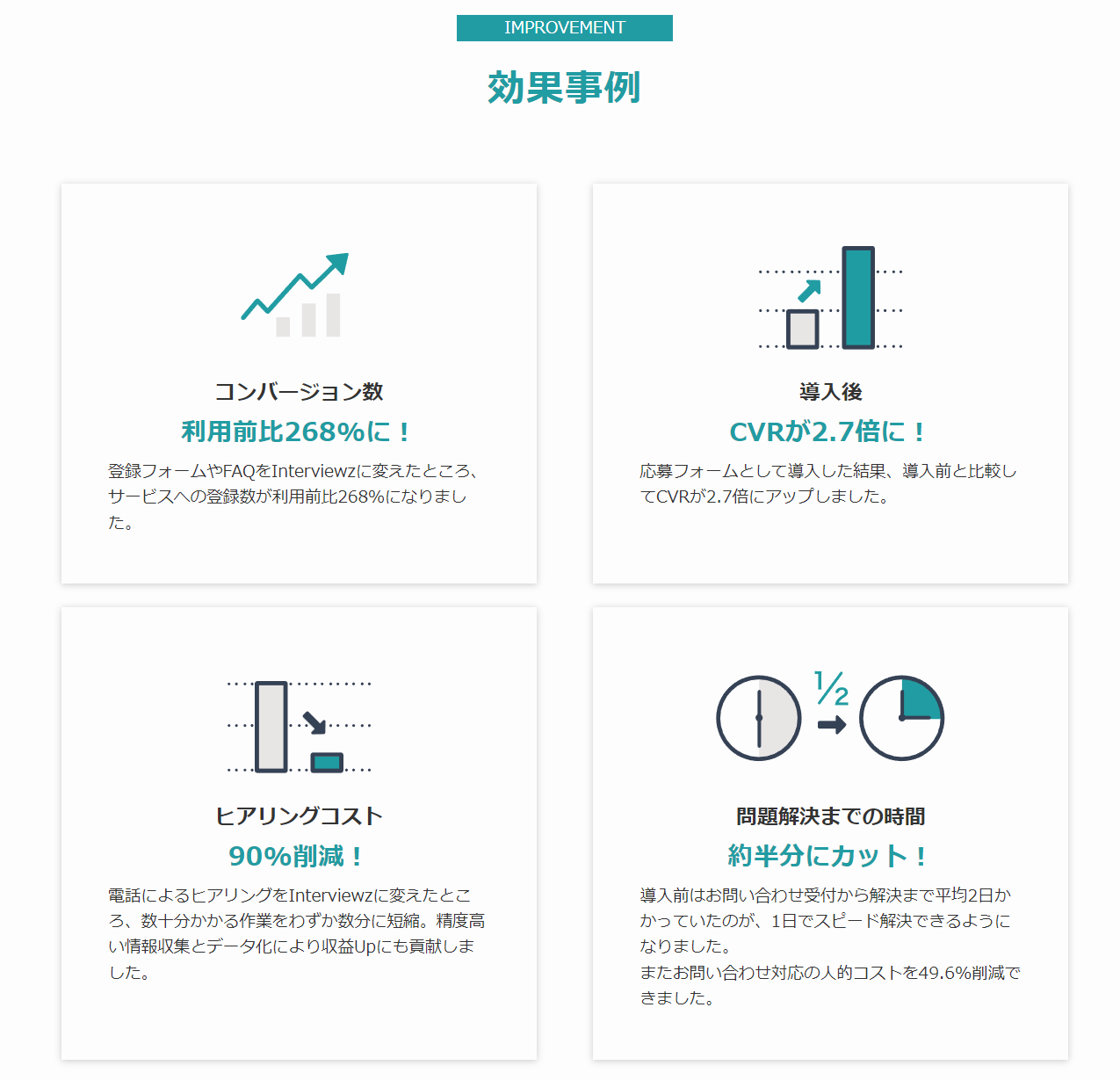 お問い合わせ数268%改善、ヒアリングコスト90%削減、サポート解決時間半減など、あらゆるビジネスプロセスで業界問わず利用実績多数。