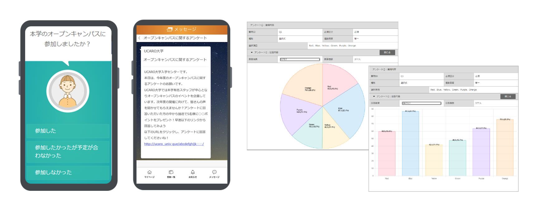 『UCARO』で保持しているステータス情報(出願履歴や入学手続状況)を使って送信対象者を細かくセグメント分けできるため、届けたいユーザへ確実にリーチすることができます。また、回答者にはタップのみで直観的に操作できる画面をご用意しています。アンケート回答結果はリアルタイムで集計され、『UCARO』/『UCARO family』のユーザ情報とあわせてデータを一元管理することが可能です。