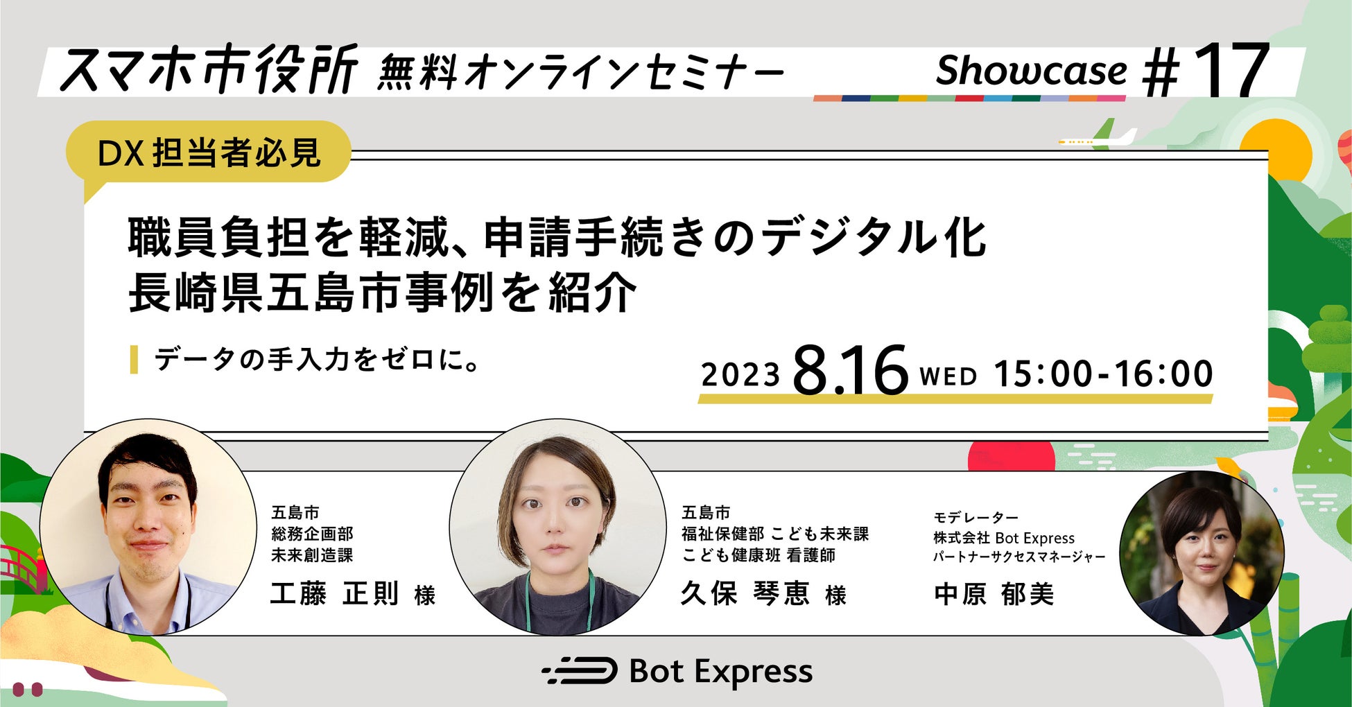 Bot Expressでは、導入自治体担当者をゲストに迎えスマホ市役所の事例を共有する無料オンラインセミナーを毎月2回開催しています。住民利用率・満足度の高いサービスの提供、そしてデジタル化による職員の負担軽減を実現したい自治体職員の皆様、ご参加お待ちしています。共に、行政サービス、そして住民の暮らしをアップデートしていきましょう。