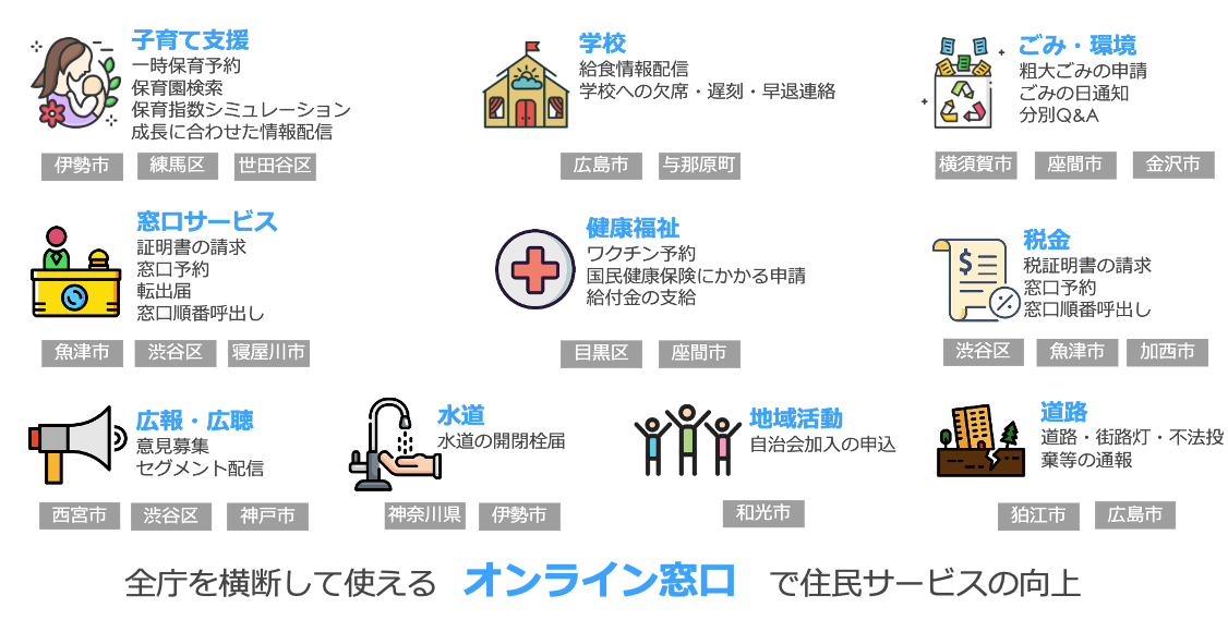粗大ごみの収集申し込みや決済、給付金の申請、避難所検索や防災メールとの連携、キャンプ場や体育館・公民館などの公共施設予約と決済、学校連絡、健診や妊婦面談予約など、あらゆる行政サービスがオンライン化されています。公的個人認証サービスを用いた証明書請求など「行かない・書かない・待たない」役所窓口の開設も拡がっています。