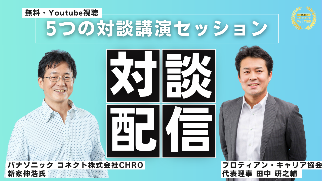 キャリア対談は、個人が自律的によりイキイキと働ける環境創りのために「カルチャー&マインド改革」「働き方改革2.0」を推進しているパナソニック コネクト CHRO新家 伸浩氏と、当協会の代表理事/法政大学キャリアデザイン学部教授田中 研之輔で実施しました。
