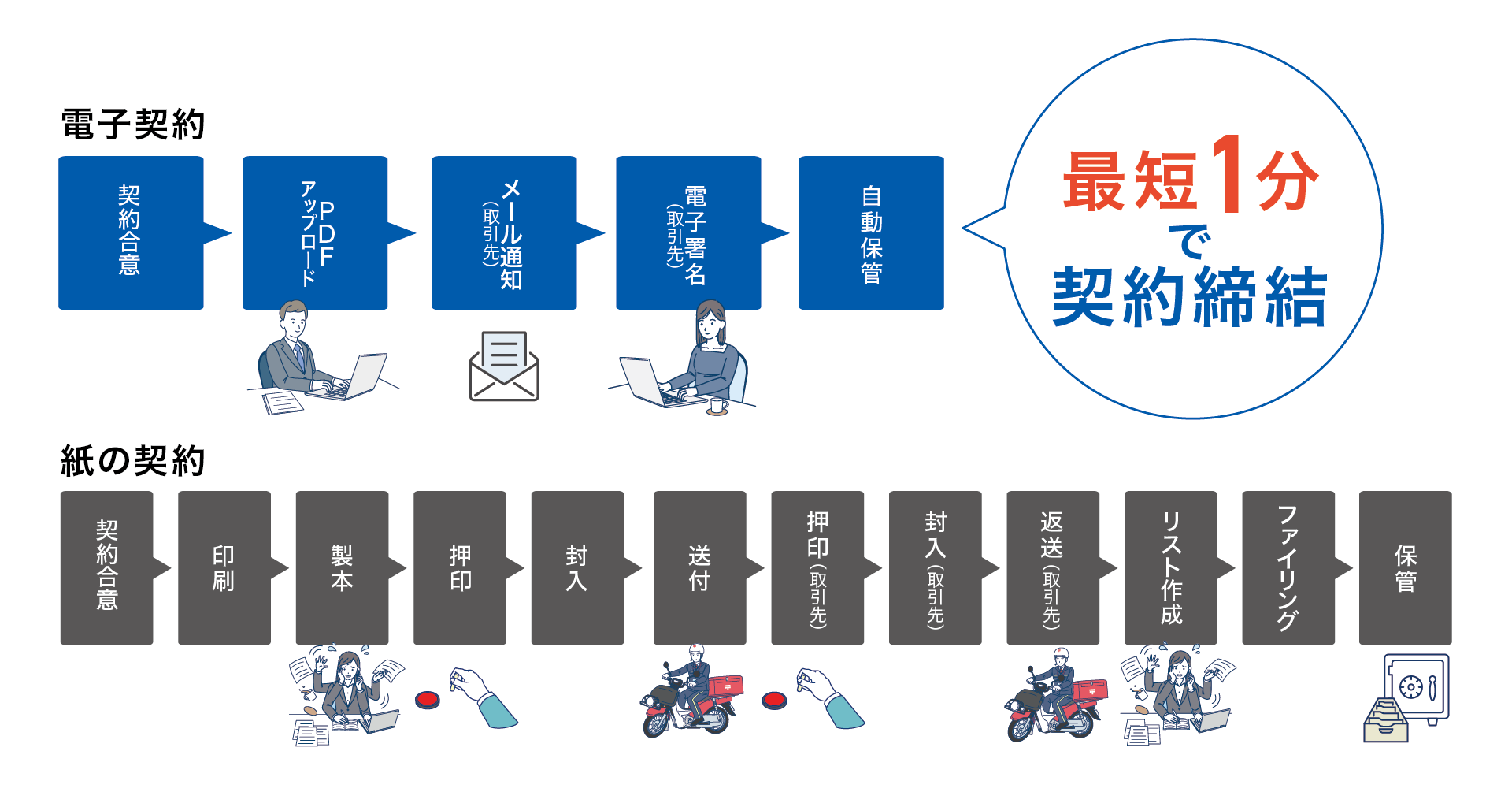 契約の締結から管理までをワンストップで行えるクラウド型の電子契約サービスです。印紙税や郵送費の削減、契約締結にかかる手間の軽減や時間の大幅な短縮により、業務の効率化を実現することができます。