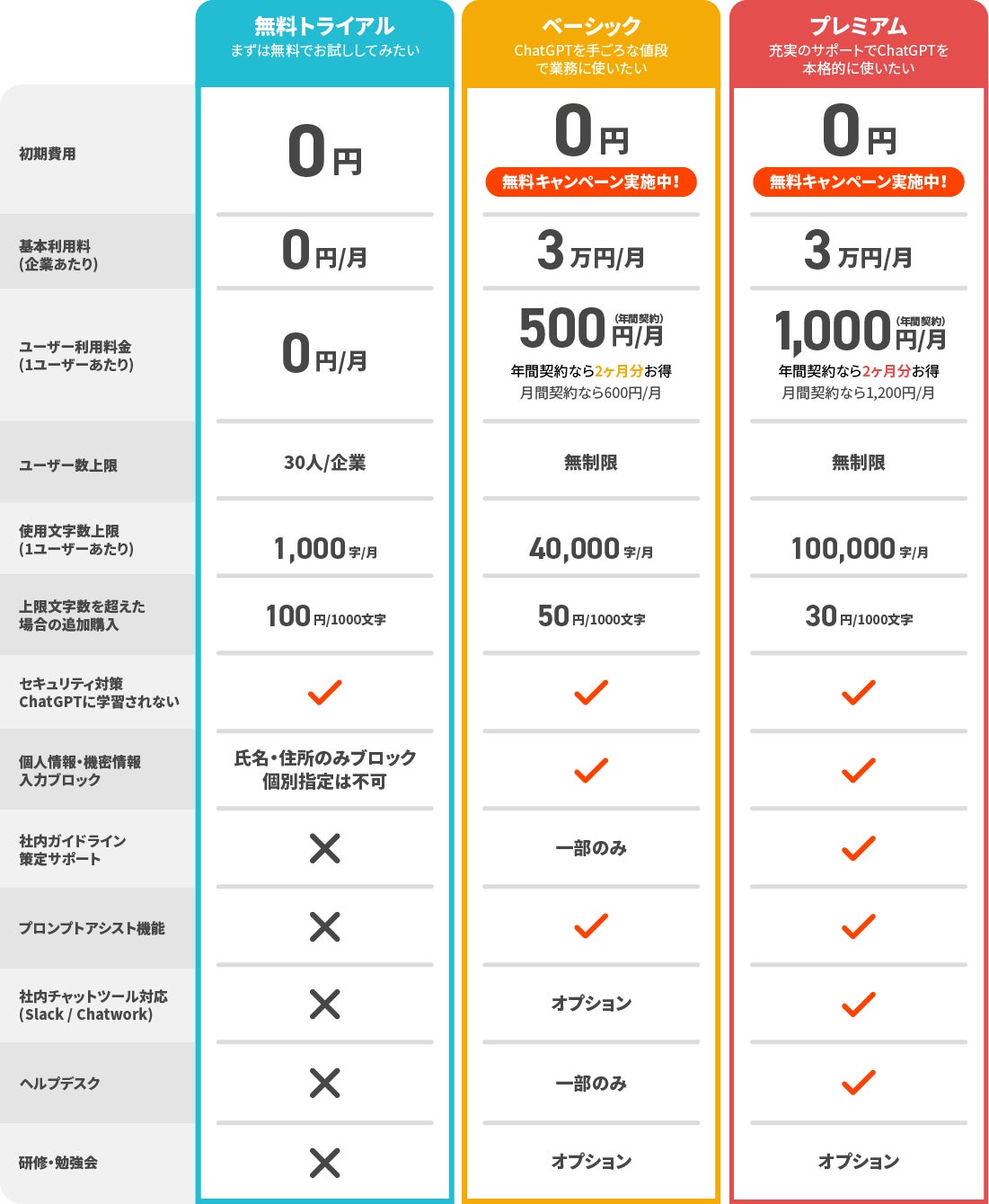 また、セキュリティ面がより堅牢でサポート面も充実の「ベーシックプラン」でも月額500円と、ChatGPT Plus(月額20ドル)や他社サービスに比べリーズナブルにご利用いただけます。