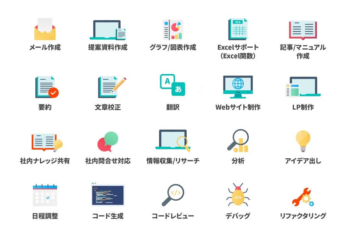 「法人AIクラウド」は営業・マーケティング・商品企画・経営企画・経理財務・人事・総務などのビジネス職からエンジニア・デザイナーまであらゆる職種の業務効率化・生産性の向上を実現し、社内DXや人手不足の解消を支援します。