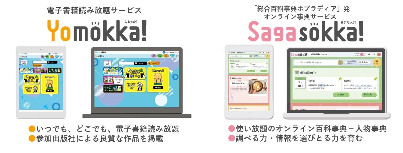 電子書籍読み放題サービス『Yomokka!』と、「総合百科事典ポプラディア」発調べ学習応援サービス『Sagasokka!(さがそっか!)』の2つのサービスを提供しています。