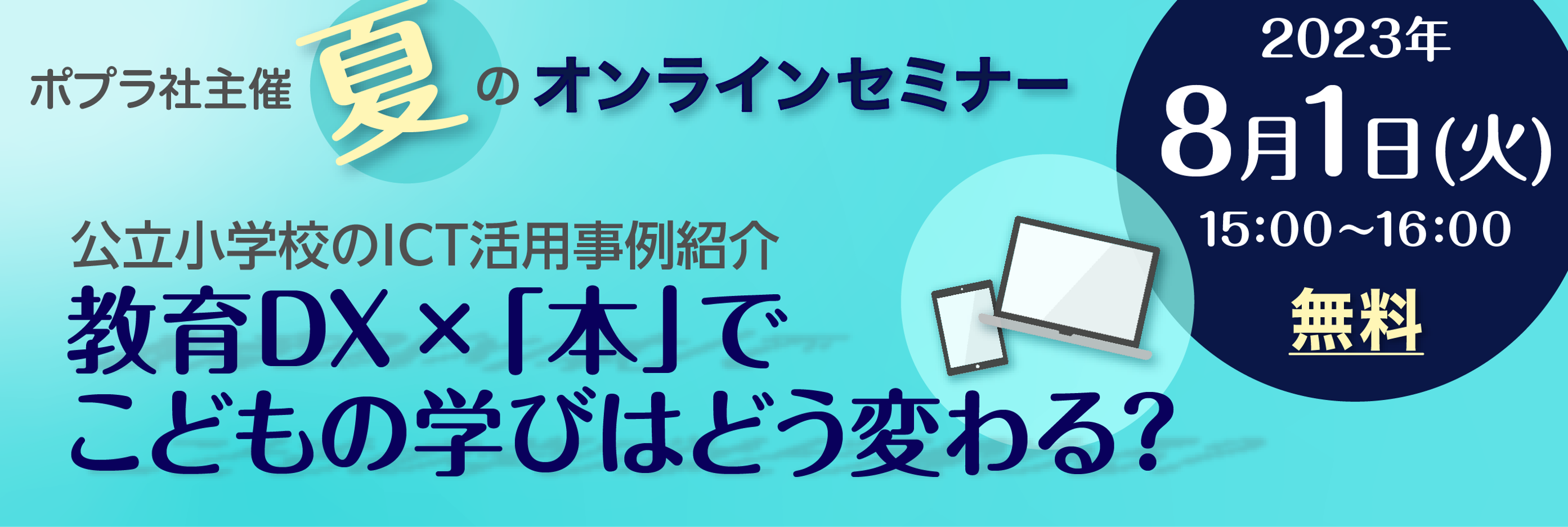 学校教育でのICT活用推進に役立てていただくため、教育委員会・学校関係者に向けて、「教育DX」「読書推進」をテーマとした無料オンラインセミナーを2023年8月1日(火)15:00〜開催します。