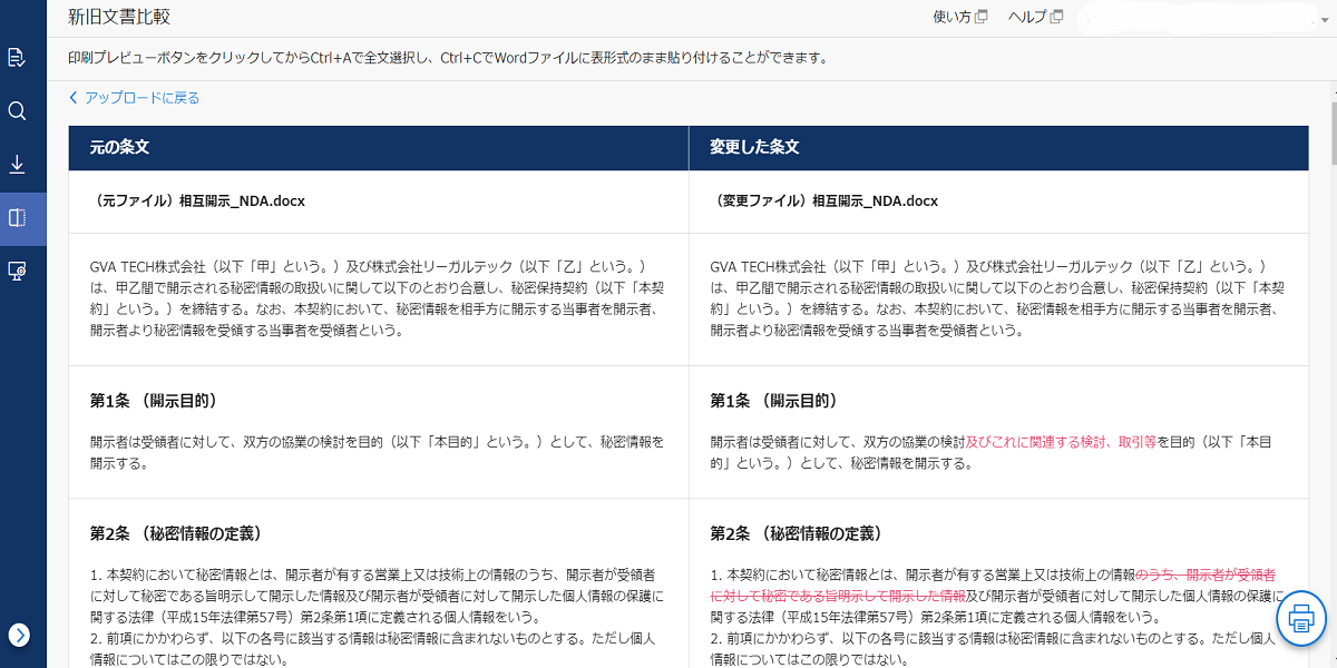 2/選択した過去契約書との差分が新旧対照表形式で表示されるため差分把握の手間が減る