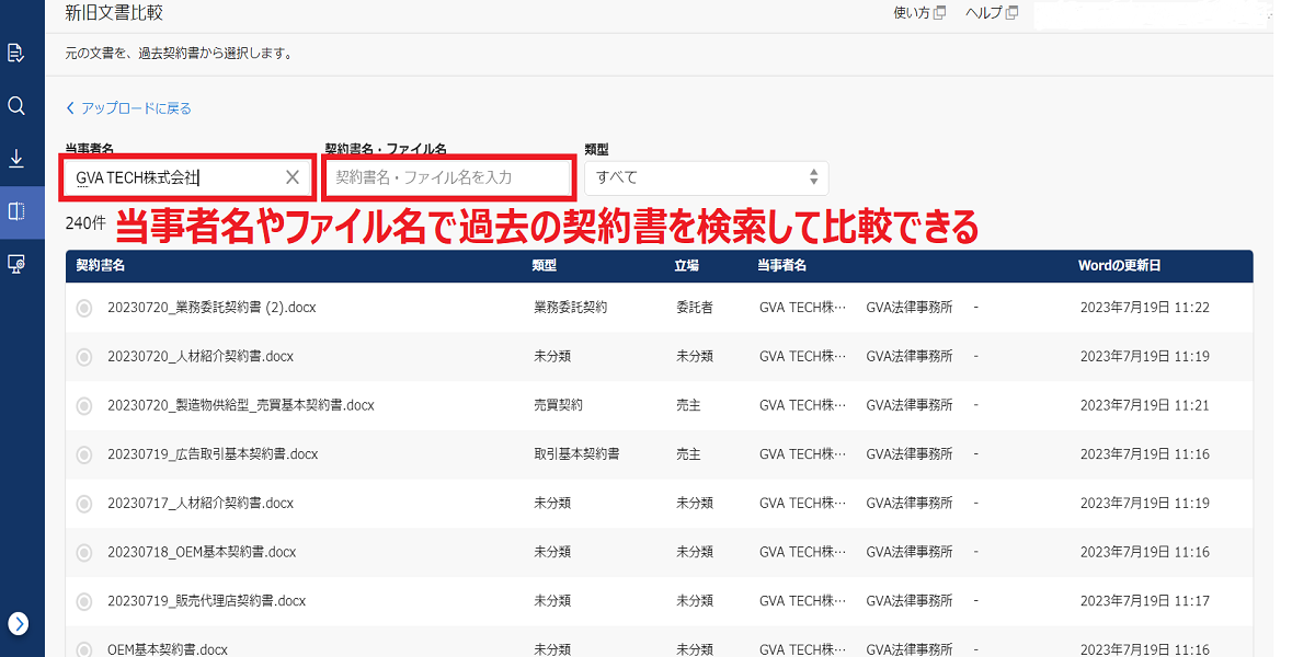 GVA assistが提供する従来の「新旧文書比較機能」では、異なる2ファイル間の差分を新旧対照表形式で表示することにより、契約書のバージョン間での差分比較や、審査対象の契約書と自社ひな型との比較など、法務担当者が契約書を確認する手間を軽減するための機能を提供してきました。今回、この文章比較機能をアップデートし、ファイル間の比較に用いる契約書としてGVA assistに保存済みの「過去契約書」も検索・比較できるようになりました。