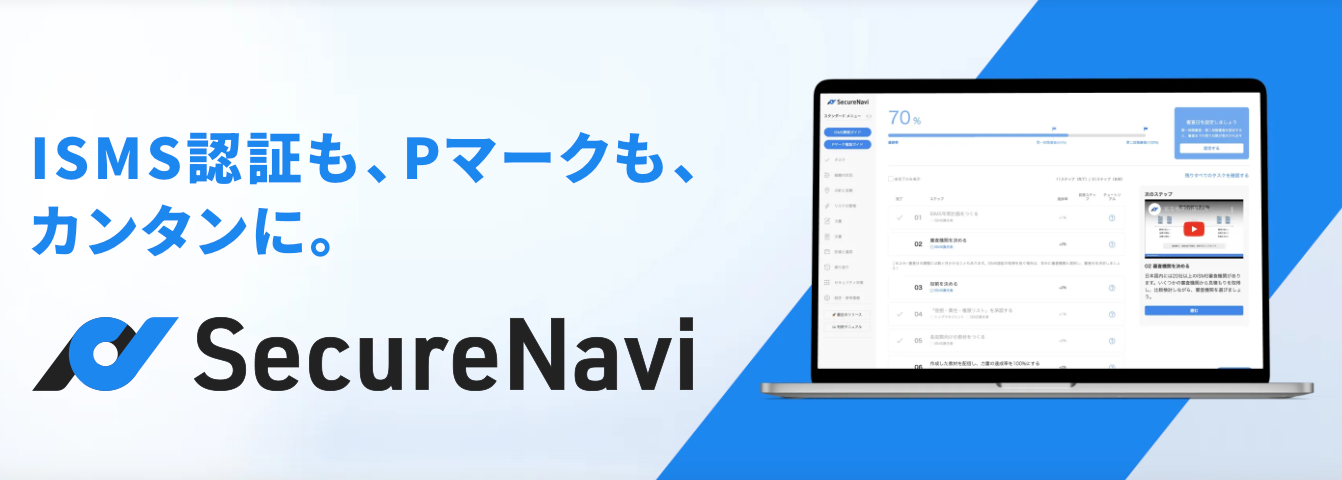 ISMS・ Pマークオートメーションツール「SecureNavi」を提供中。ISMS認証やPマークにおける取り組みの自動化・効率化を実現し、組織の情報セキュリティレベルを向上させるクラウドサービスです。従来のようなExcelやWordによるアナログな運用を削減し、無駄のない必要最低限の工数・リソースで認証取得・運用が可能になります。
