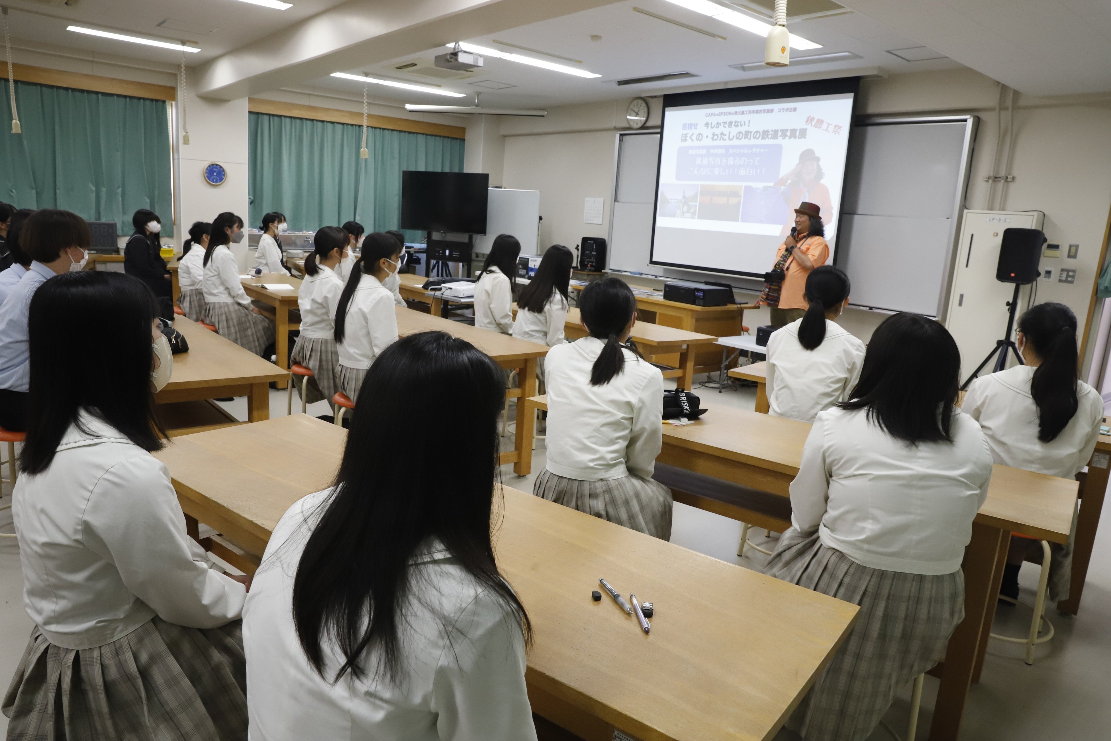 本プロジェクトでは、鉄道写真家として精力的な活動を続ける中井精也さんを起用。実地指導第一回では、普段、鉄道写真をあまり撮ったことのない生徒たちに鉄道車両が写っているものだけが「鉄道写真」ではないことを、伝えました。