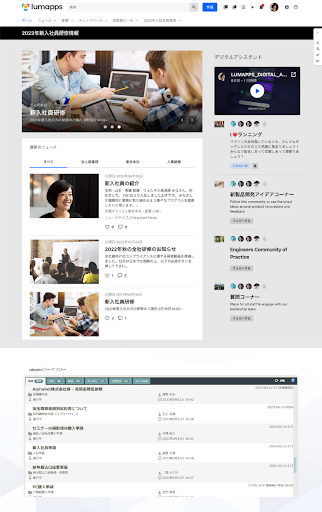 LumAppsは、従業員同士の情報共有やコミュニケーションを通じて、エンゲージメントを高めるために設計された法人向け従業員エクスペリエンスプラットフォームです。 LumApps は、組織内のコミュニケーションの壁を取り払い、従業員同士や部門間のより強力で協調的な関係を構築するのに役立ちます。 LumApps は、Google Workspace や Microsoft 365 とシームレスに連携し、業務に必要なあらゆるコンテンツや情報へのアクセスを1つのプラットフォームで一元化します。