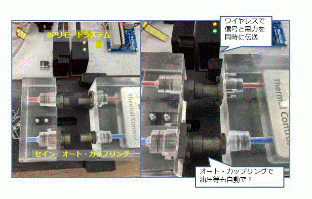 リモートセンサでワイヤレスで給電と信号、オートカップリングでエアや油圧を自動で送ることが可能になり、設備の自動化に貢献します。コラボレーションにより、例えば、設備の治具、金型等の自動着脱、ロボットのATC(オート・ツール・チェンジャ)の自動交換、工作機械のツールの自動交換等幅広いアプリケーションに有効的に活用可能です。