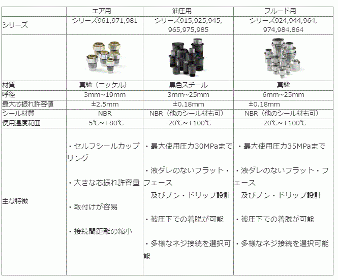 CEJN社のオートカップリングの代表的なものとしてエア用、油圧用、フルード用があります。