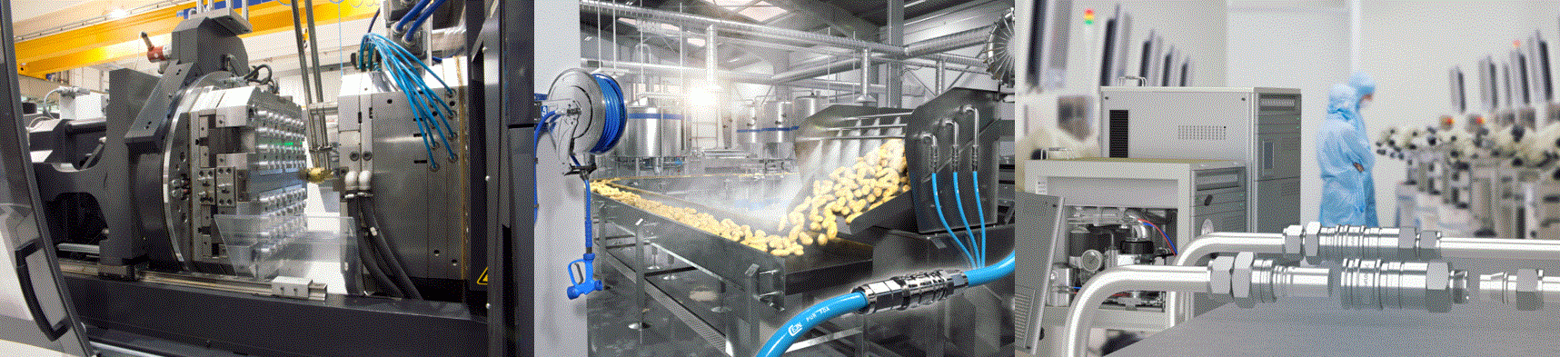 主力製品は圧縮空気に始まり、ブリージングエア・フルード・油圧に至るあらゆる流体用のクイック・コネクトカッ プリング及びニップル(迅速流体継手)になります。
