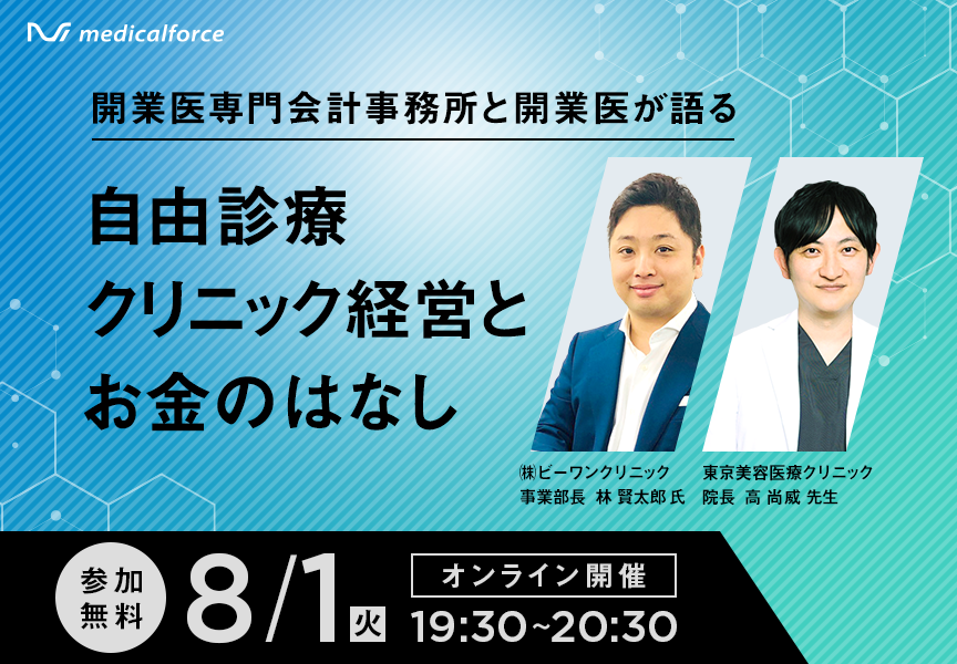開業医専門会計事務所より事業部長の林氏、2ブランド4院の美容クリニックを経営される開業医の高尚威先生を迎え、自由診療クリニック経営を成功させるために必要な”お金”の話をたっぷり伺います。