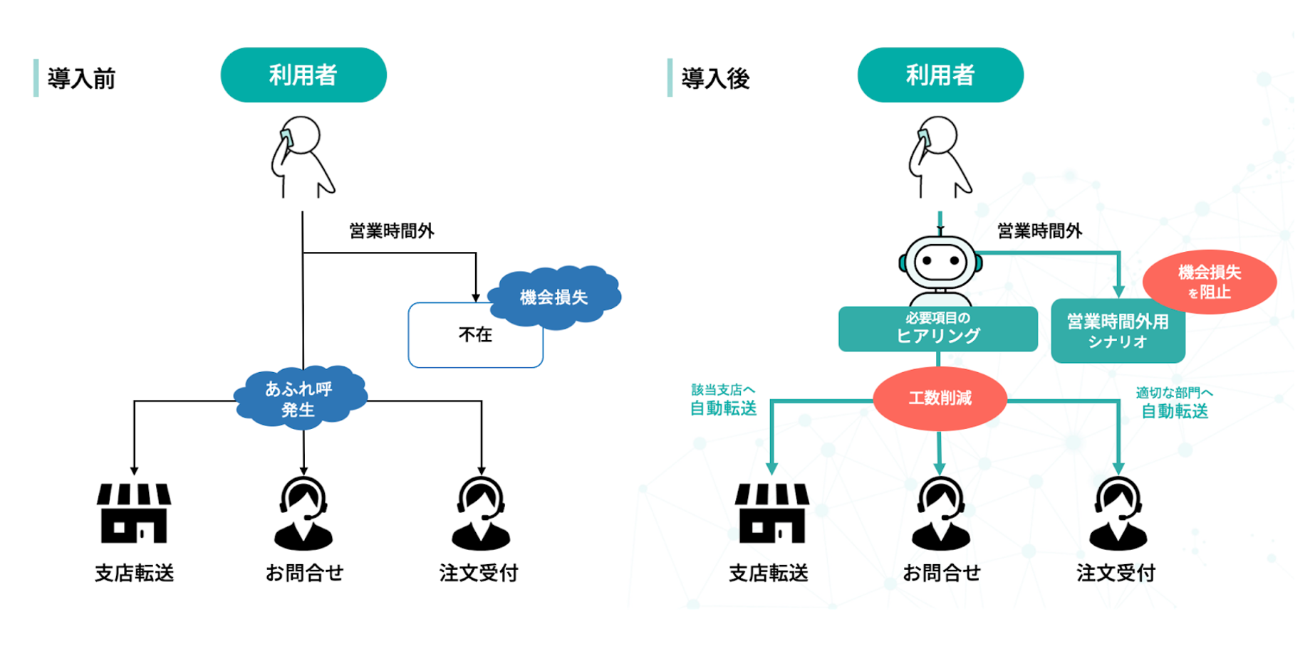入電があった際にお客様のお住まいの地域に該当する支店への振り分け(転送)を全てオペレーターにて行っており、、オペレーターの業務工数が逼迫、その結果、電話殺到時にはお客様をお待たせしてしまうといったユーザビリティの低下や営業時間外の問い合わせに対応ができないことによる売上機会の損失が懸念されておりました。