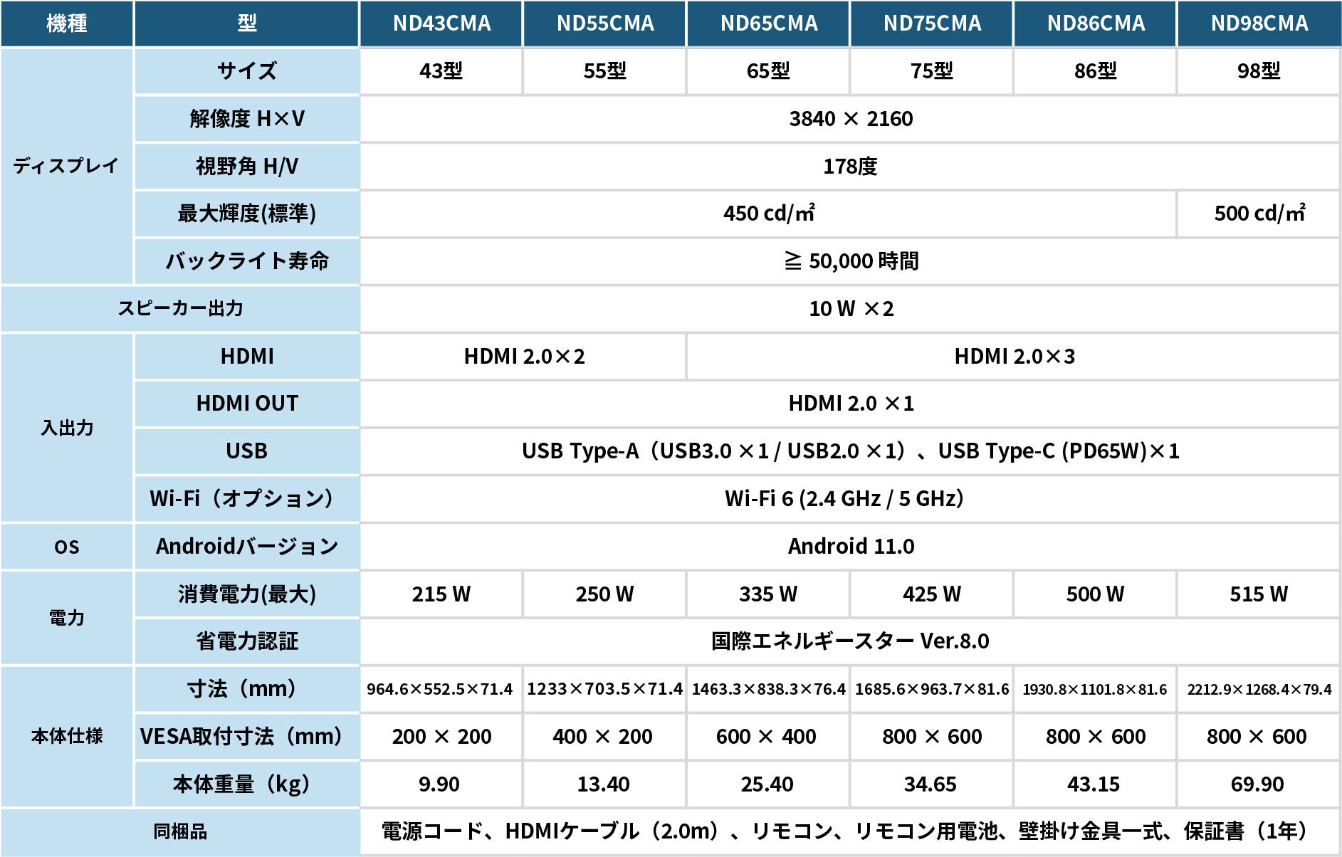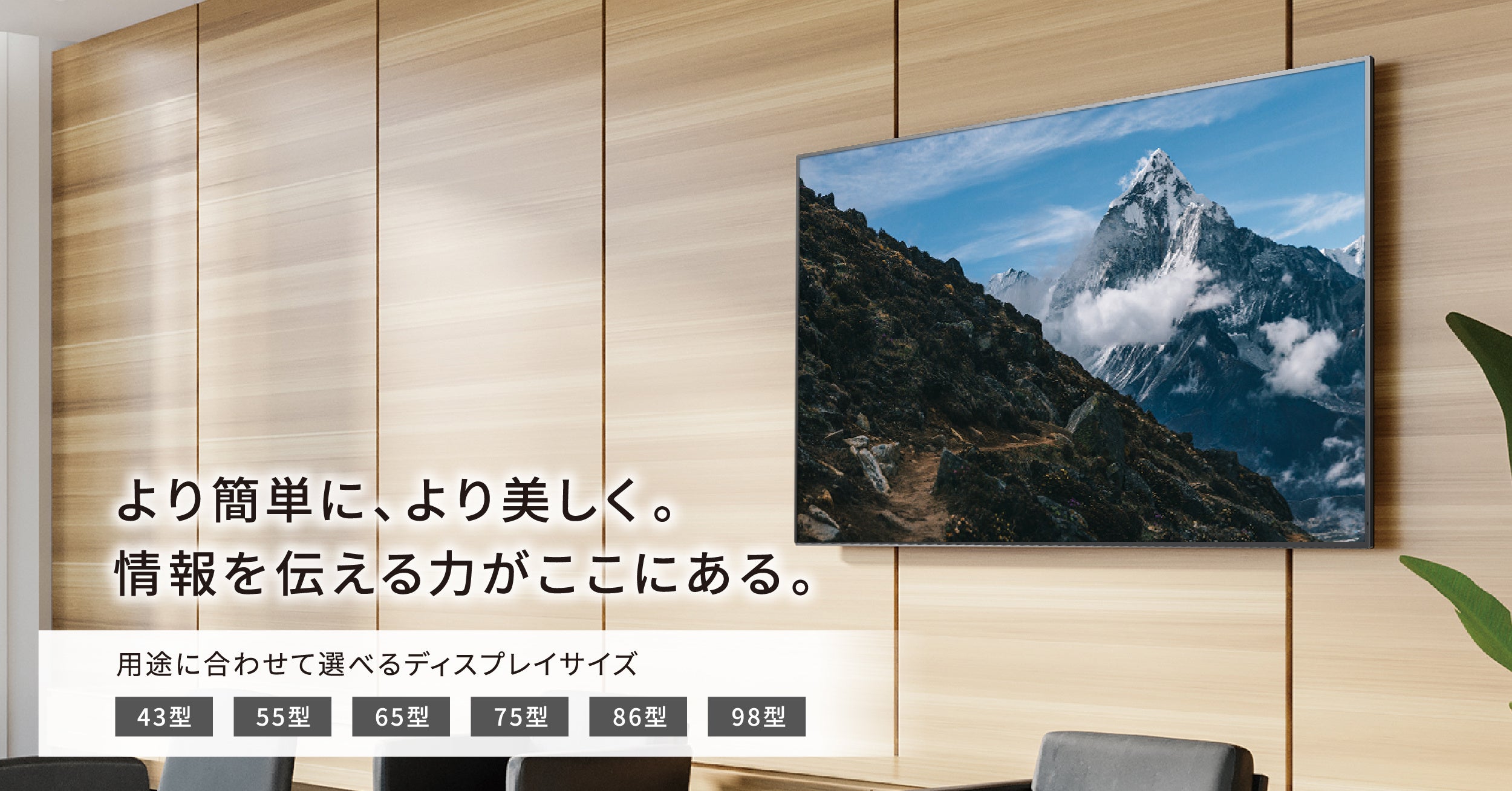 街中の小売店や、飲食店、クリニックでイメージ映像や環境映像を流して空間演出をしたり、紙媒体の代わりに店頭販促に導入したりなど、生活の中でデジタルサイネージを目にする機会が増加しています。5Gの時代の到来やデジタル技術の進化により、その存在感を高め、今後より活用方法が多様化していくと予想されます。そこでユーザーがデジタルサイネージに求めるのは、いかに簡単に美しく情報を投影・伝達できるかではないでしょうか。簡単な操作性・汎用性の高さは業務効率の向上、美しい映像は販売促進・企業のイメージアップに繋がると考えられます。今回発売する「デジタルサイネージ」はこれまで弊社が取り扱っていたデジタルサイネージをアップグレードさせた製品です。これまでの映像の美しさや簡便性をそのままに、さらに使い勝手良く、タフに、そして環境にも優しい製品(国際エネルギースタープログラム*適合)へ進化いたしました。43型から98型までの豊富なサイズ展開で、全型縦置き対応のため、設置場所や用途にあわせて幅広いシーンで活躍できます。また、Android 11.0が標準搭載されているため、追加機器を購入せずとも電源を入れるだけで、映像を投影できます。さらに、スマートフォンやUSBから直接データを転送し、指定した時間に自動再生することも可能です。これにより、無人で時間帯毎に投影する映像を変えるなど、業務効率を向上しつつ、効果的に情報を伝達することができます。