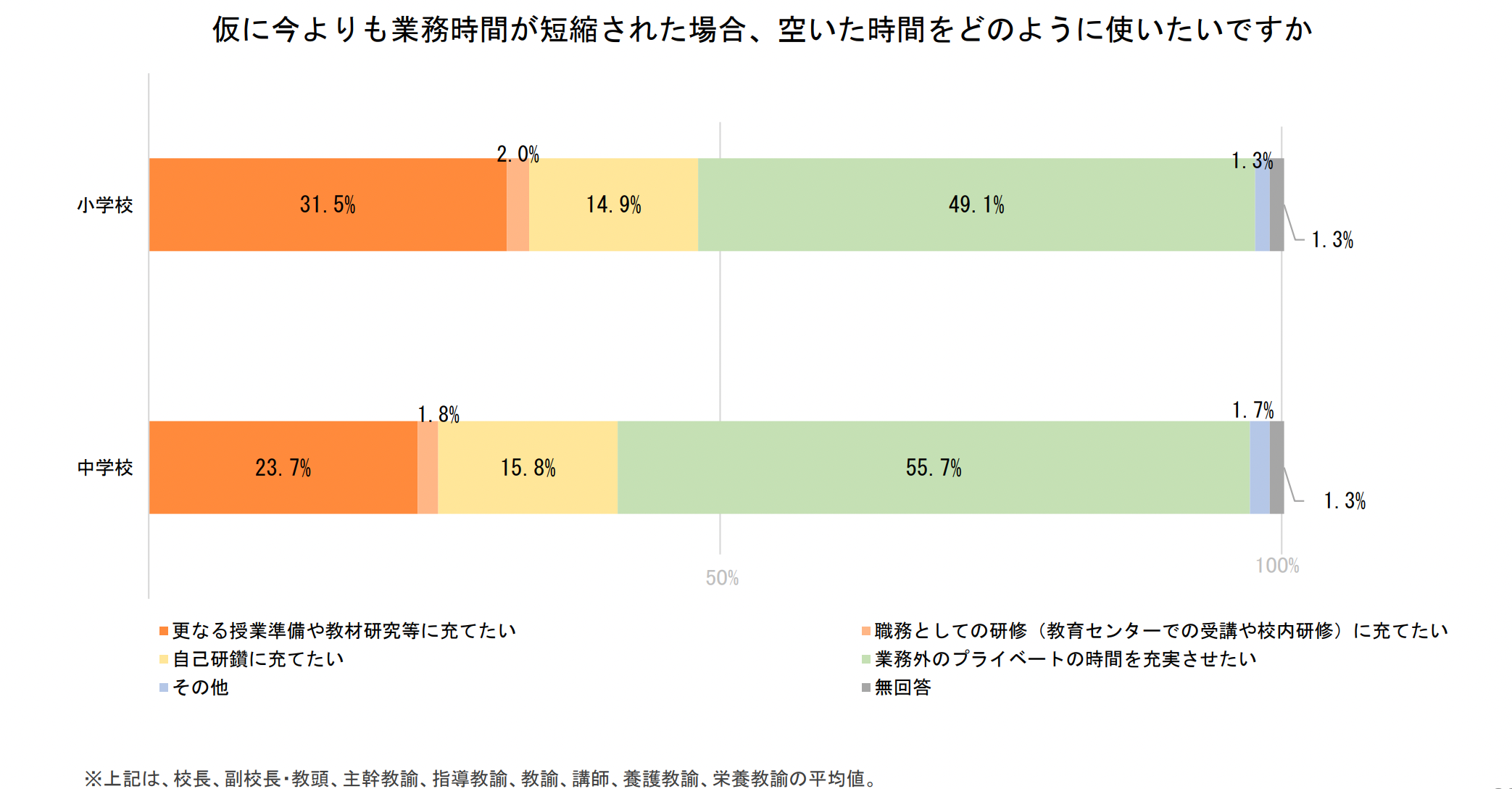 また、仮に今よりも業務が短縮され空き時間ができた場合の時間を小学校では約48%の先生が授業の質の向上にあてたいと回答しました。先生が、今の多忙な状況でも自分の授業の質を高めるための手段を求めていることが伺えます。