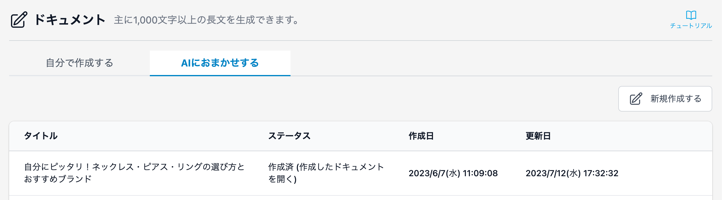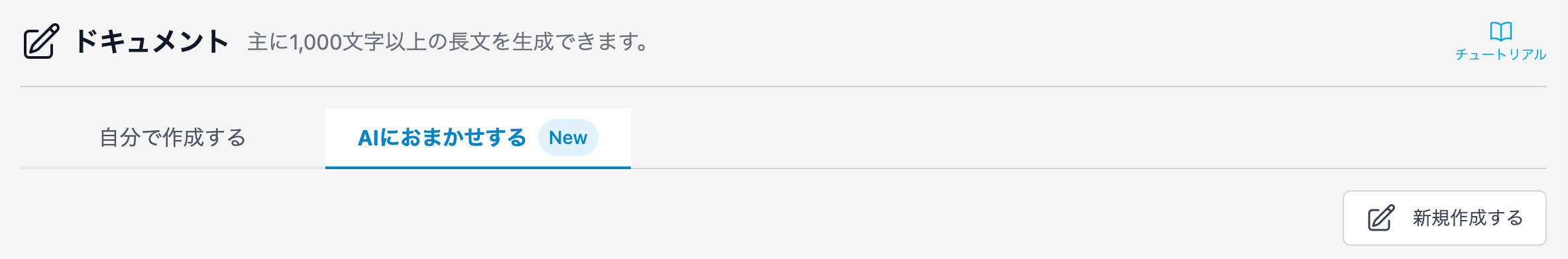 Transcopeの[ドキュメント]メニューの[AIにおまかせする]タブから、[新規作成する]ボタンをクリックしてください。