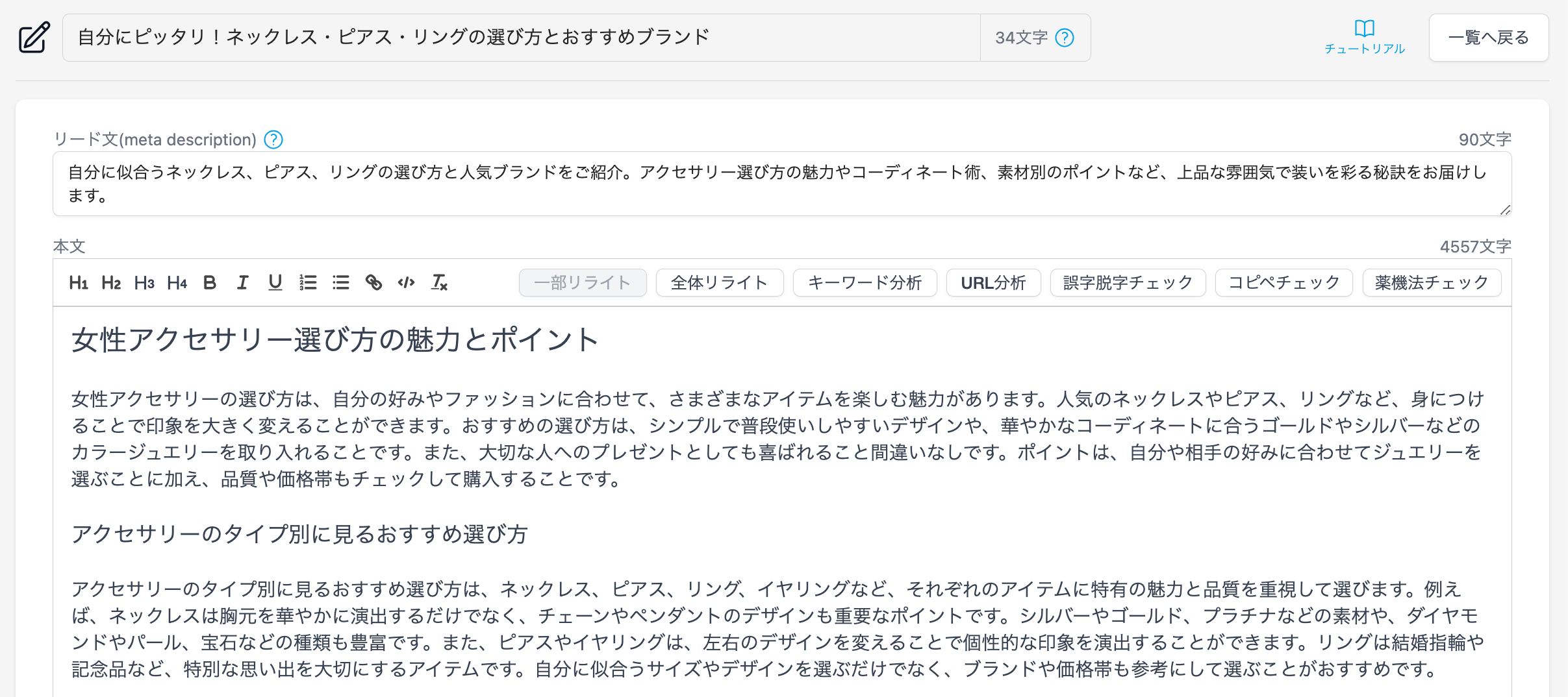 上記のご意見をうけて、タイトルと見出しを入力するだけで適切な文字数のメタディスクリプションが自動生成される機能をリリースいたしました。当機能により、リード文やメタディスクリプションを考える手間がなくなり、より効率的にライティング作業を行えることに成功いたしました。