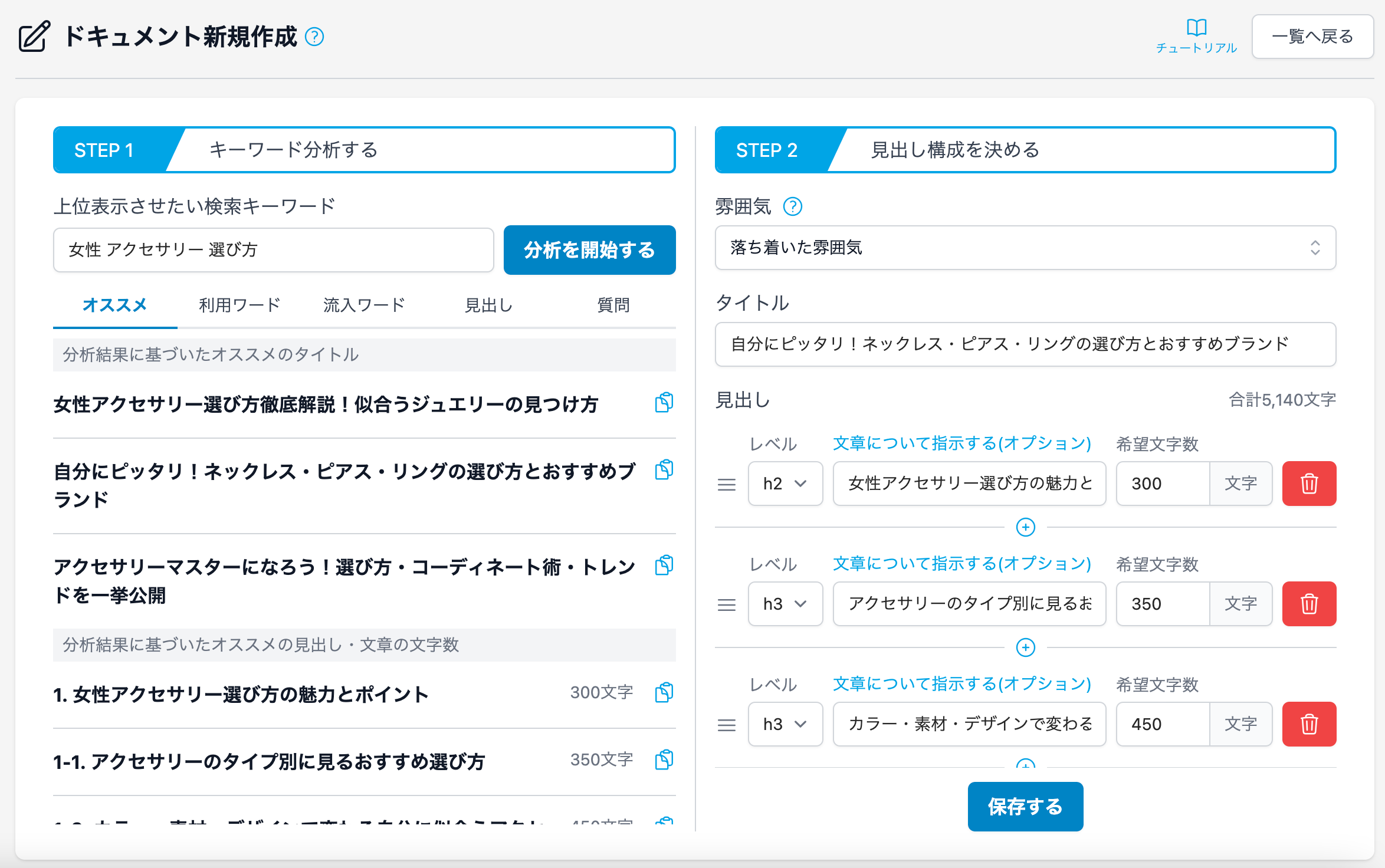 [上位表示させたい検索キーワード]を入力して、分析を行うと、記事に最適なタイトルや見出し、文章の文字数が自動的に提案されます。