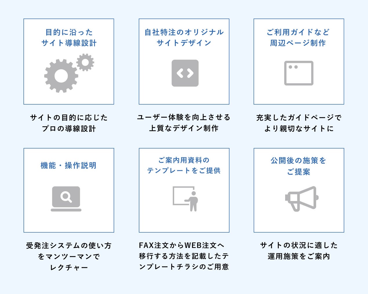 ノウハウや経験がなくても安心。Bcartの内部設定からプロの動線設計・オリジナルデザイン制作まで、全て私たちが担当します。また、お客様への案内資料やマニュアルテンプレートのご用意、さらにはサイト公開後に必要な集客からリピーター施策のご相談も行えます。